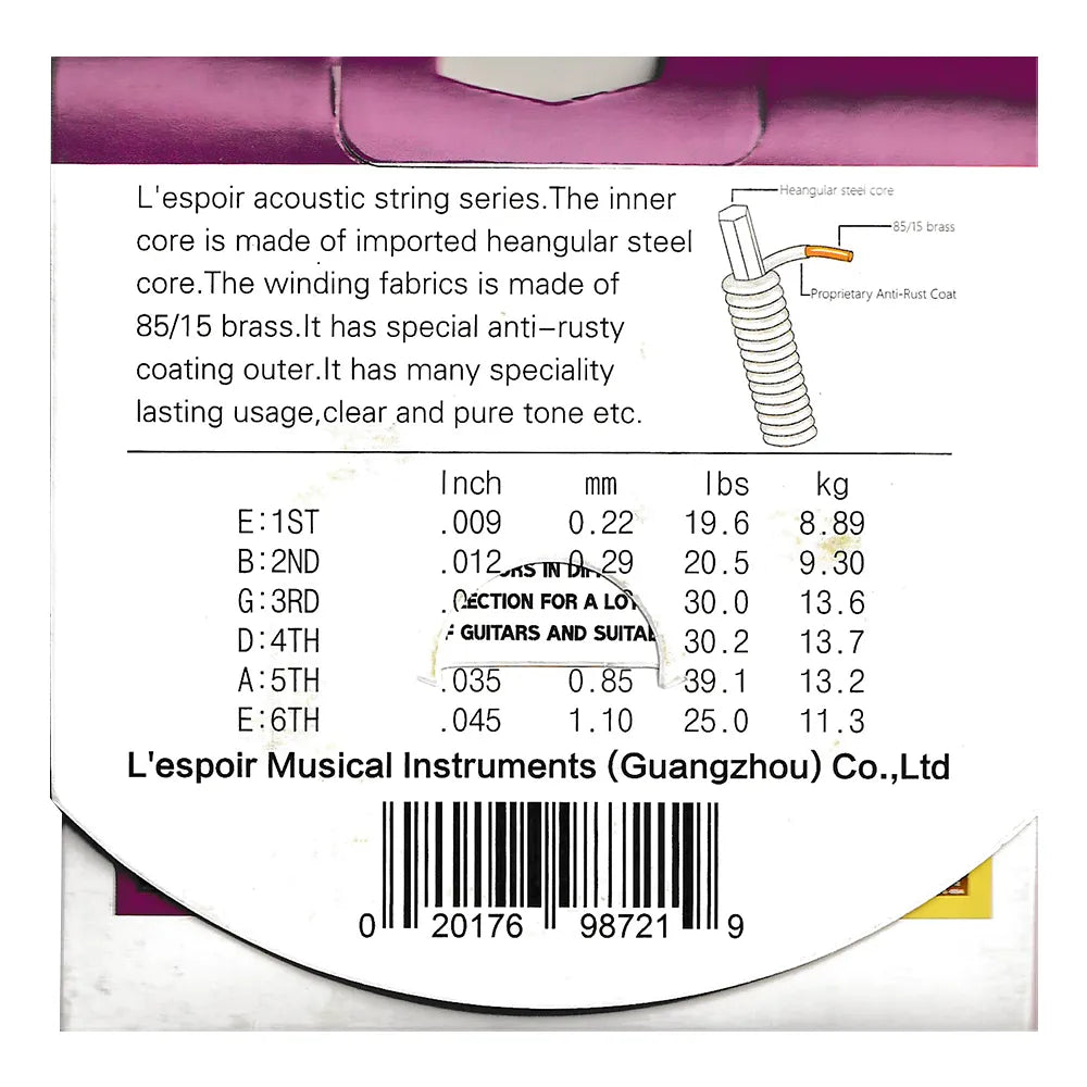 Las Cuerdas Guirarra Acustica 9" L'espoir son fabricadas con acero hexagonal cubierto por cobre 85/15 y antioxidante, lo que garantiza un tono puro y claro. Estas cuerdas son de alta duración, asegurando una calidad excepcional en cada uso. Perfectas para músicos de todo tipo.