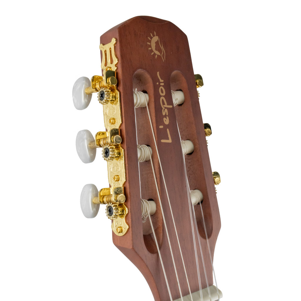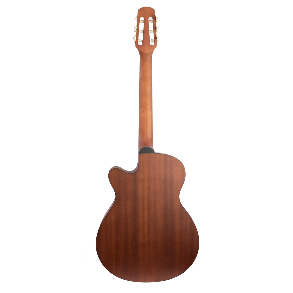 Cuerpo de sapele: madera con tonalidad cálida, con buen equilibrio de graves y agudos, ideal para guitarra acústica clásica.