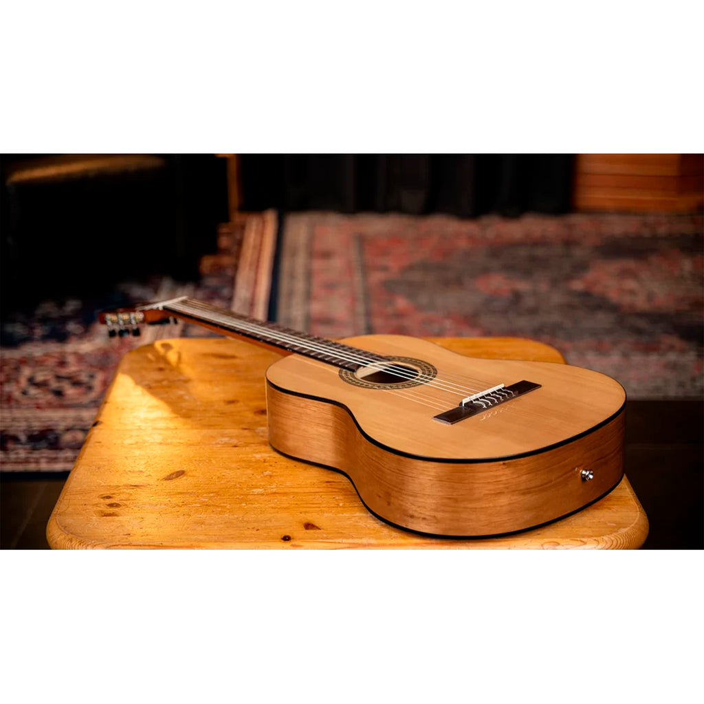 Ideal para estudiantes y principiantes: tamaño 4/4, cuerdas de nailon suaves, mástil cómodo, y accesorios incluidos.