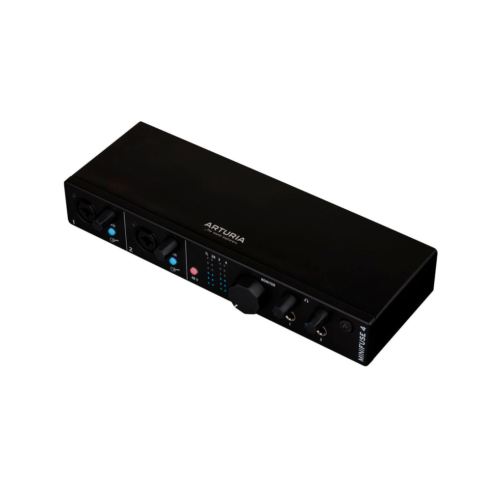 La Arturia MiniFuse 4 es una interfaz de audio y MIDI de escritorio potente y versátil, ideal para estudios caseros, bandas, productores y creadores de contenido. Ofrece 4 entradas y 4 salidas analógicas, doble salida de auriculares y conectividad MIDI de 5 pines, junto con un hub USB integrado para conectar controladores u otros dispositivos. Su chasis de aluminio es robusto y portátil, y su diseño incluye medidores VU en color, controles de ganancia retroiluminados y alimentación phantom de 48 V para micrófonos de condensador. Además, incluye un conjunto de software profesional (“Analog Lab Intro”, “Ableton Live Lite”, efectos de Arturia, etc.) para producir desde el primer momento.