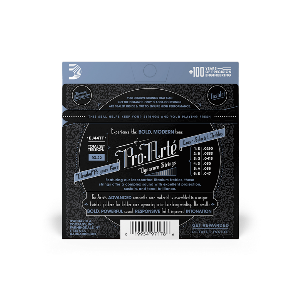 Las EJ44TT son cuerdas de guitarra acústica de la marca D'Addario, específicamente diseñadas para ofrecer un sonido cálido y equilibrado, ideal para guitarristas que buscan un tono rico y duradero. Están hechas de material de nylon para las cuerdas de treble (las cuerdas agudas) y una bobina de plata sobre núcleo de nylon para las cuerdas graves, lo que les otorga un tono suave pero con un brillo destacado. Este conjunto de cuerdas es parte de la serie Titanium de D'Addario, conocida por su alta resistencia y longevidad.
