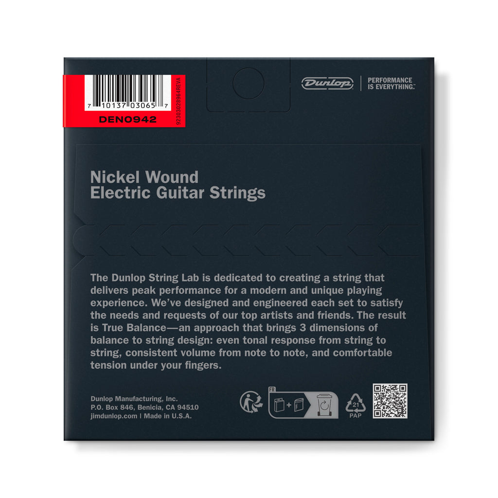 Las cuerdas DEN0942 de Jim Dunlop son parte de la serie "Dunlop Nickel Plated Steel", que está especialmente diseñada para guitarristas que buscan una combinación de durabilidad, tono brillante y comodidad. Estas cuerdas están fabricadas con un núcleo de acero de alta calidad, recubierto con una capa de níquel que les otorga una excelente resistencia al desgaste y una tonalidad brillante y definida.
