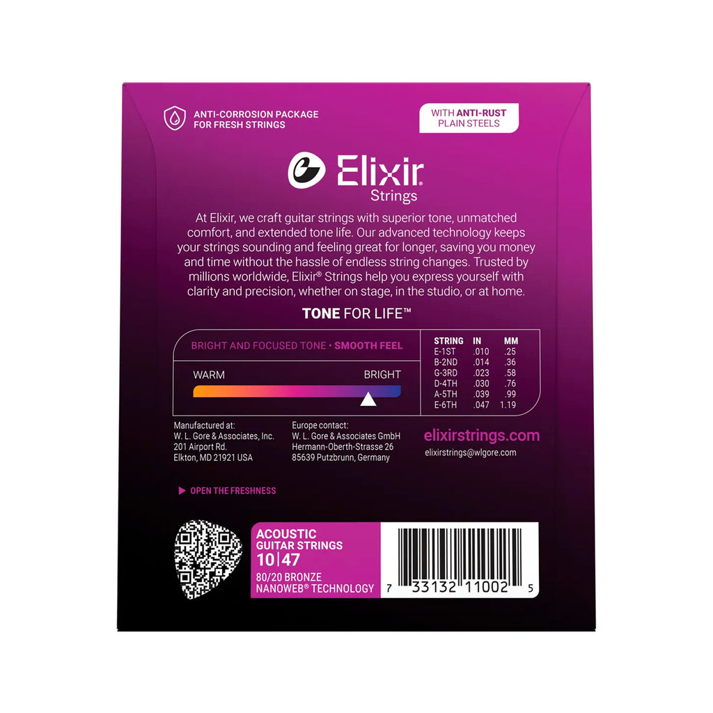 El set Elixir 11002 está diseñado para guitarras acústicas. Pertenece a la línea con recubrimiento protector Elixir NANOWEB ®, lo que ayuda a mantener el tono más tiempo al proteger las cuerdas de sudor, suciedad y corrosión. Gracias al recubrimiento y al calibre “extra-light” (.010–.047), ofrecen una tensión cómoda, tacto suave, menos esfuerzo al tocar, y buen balance tonal: agudos claros, graves definidos y buena proyección — ideal para estilos como folk, balada, pop, fingerstyle o para principiantes que buscan sensibilidad y facilidad.