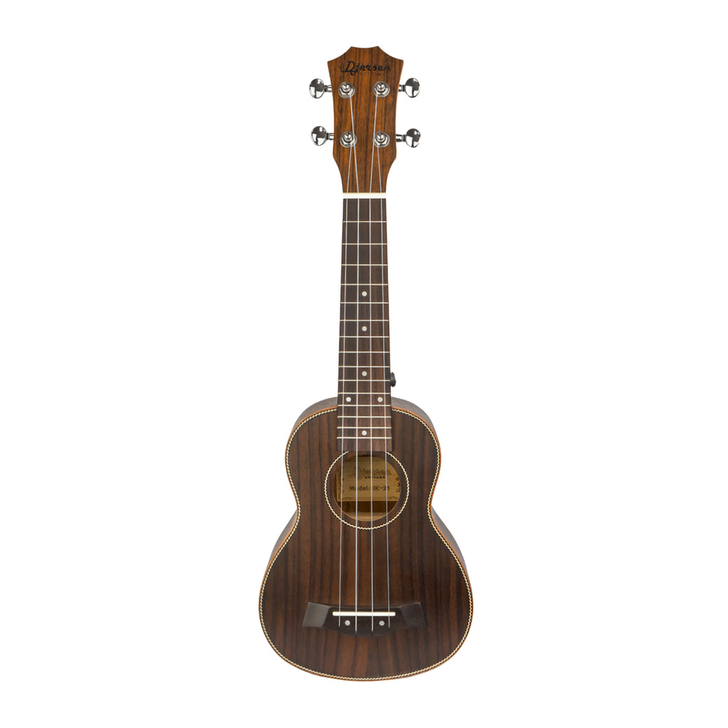 El Ukulele Djersen UK-ROSEWOOD-21″ es un instrumento de cuerdas de nylon construido completamente en palisandro, lo que le aporta una estética natural elegante y una respuesta sonora cálida y equilibrada. Su fabricación integral en esta madera incluye tapa delantera, laterales, fondo, diapasón y puente, ofreciendo uniformidad visual y estructural.