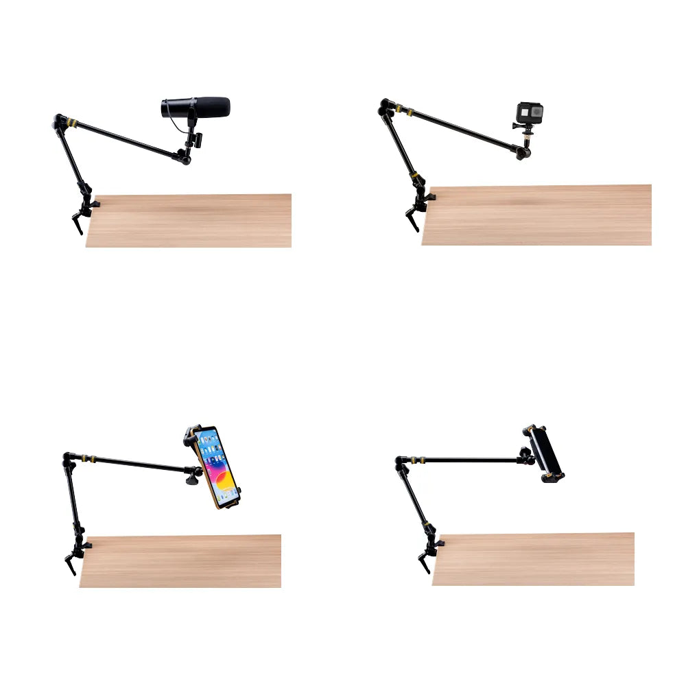 Ideal para creadores de contenido, podcasters y músicos que buscan un montaje limpio, seguro y funcional sin necesidad de trípodes voluminosos.