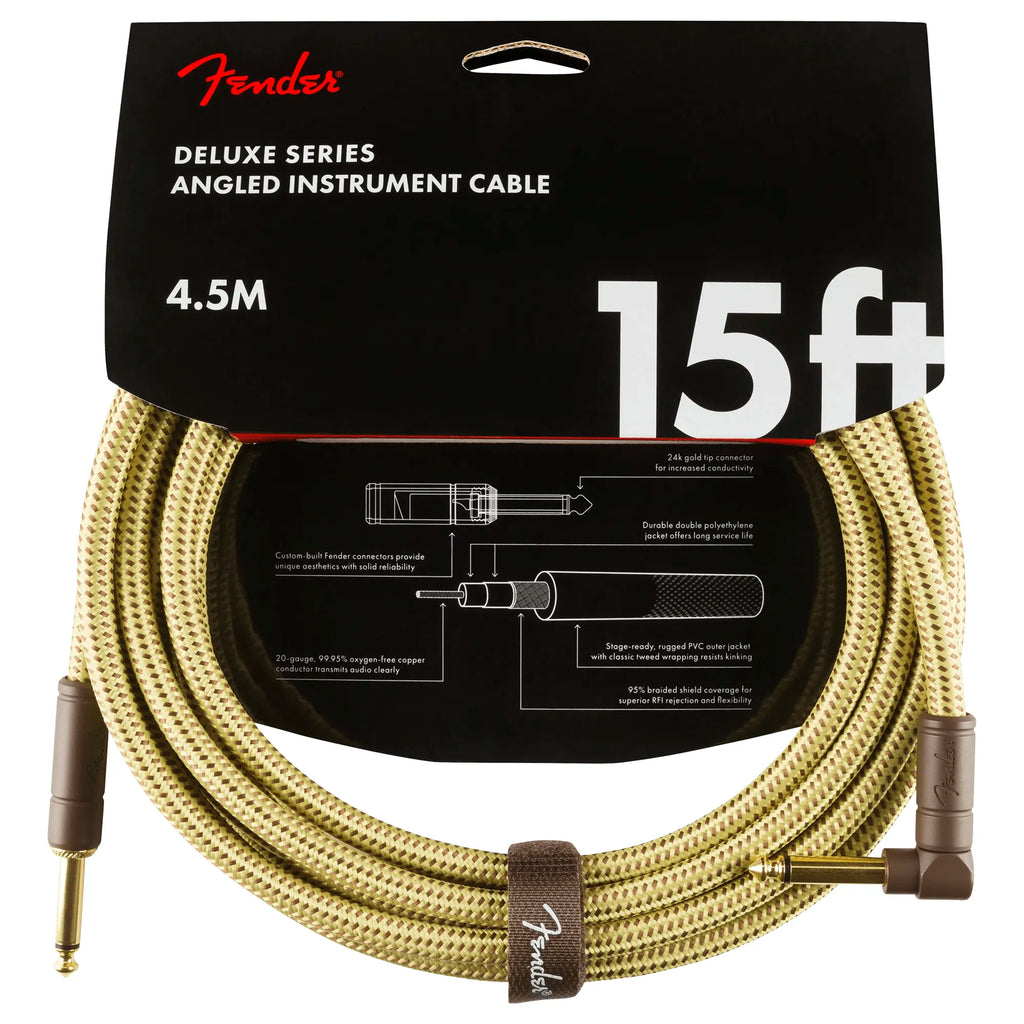 Este cable de instrumento de 4.5 metros (15 pies) de la série Deluxe de Fender es una combinación premium de estilo clásico y rendimiento profesional. Con conectores TS 1/4" recto y L, perfecta para guitarras, bajos o teclados.