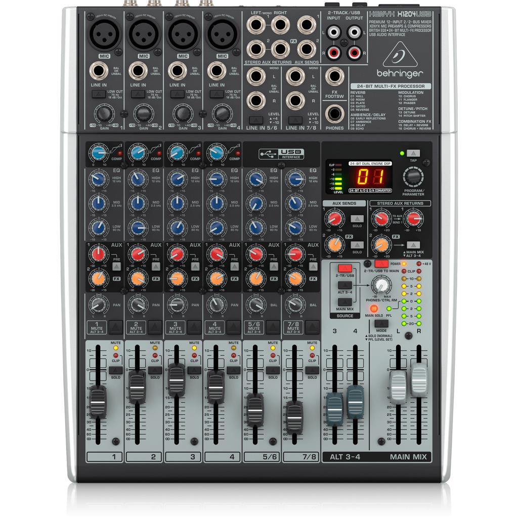 La Xenyx X1204USB de Behringer es una mesa de mezclas de 12 canales que combina un rendimiento de alta calidad con la comodidad de una interfaz USB, ideal para músicos, DJs, podcasters y creadores de contenido. Está equipada con preamplificadores Xenyx de alta calidad, que proporcionan un sonido claro y cálido, y un sistema de mezcla intuitivo que permite manejar múltiples fuentes de audio sin complicaciones. Además, la mesa incluye efectos integrados KLARK TEKNIK y una interfaz de audio USB de 24 bits para la conexión directa con tu computadora o dispositivo.