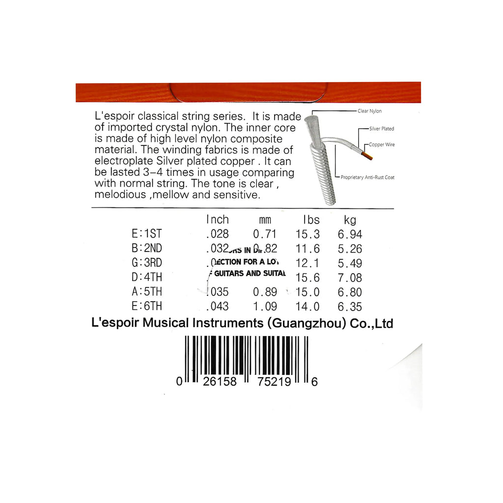 Las cuerdas de guitarra acústica Lespoir - LC-18 de tensión normal están hechas con nylon transparente de alta calidad, lo que les otorga un tono claro y melodioso. Además, las últimas 3 cuerdas están entorchadas con cobre plateado, lo que les permite durar de 3 a 4 veces más que unas cuerdas normales. ¡Disfruta de un sonido excepcional por más tiempo con estas cuerdas de alta durabilidad!