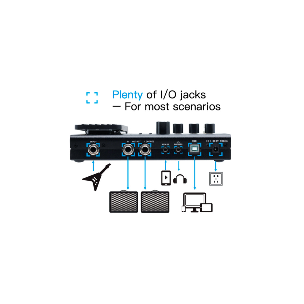 Looper y drum-machine integrados: perfecto para practicar, componer o hacer jamming.