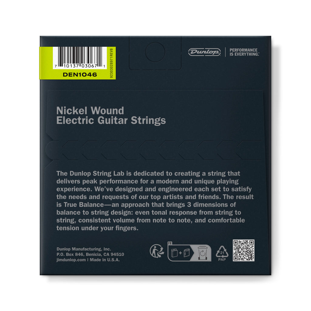 Las cuerdas Dunlop DEN1046 están fabricadas con materiales de alta calidad y están pensadas para guitarristas que buscan un rendimiento profesional y duradero en su instrumento. Estas cuerdas están diseñadas para proporcionar un tono brillante y equilibrado, con una sensación cómoda al tacto, lo que facilita tanto los acordes como las melodías.
